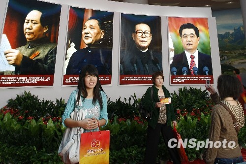 图为参观者在展览馆入口处与领导人照片合影。中新社发 盛佳鹏 摄