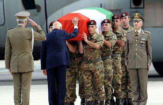 9月20日,在阿富汗首都喀布尔17日中午发生的自杀式汽车炸弹爆炸事件中身亡的6名意大利士兵的遗体运抵罗马。