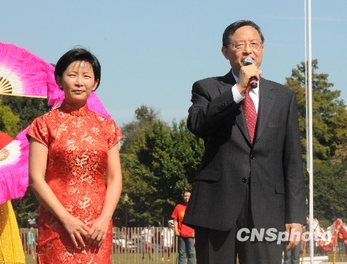 图为中国驻美大使周文重(右)在庆祝活动上致辞,左为美国大华府地区同乡会协会会长何晓慧。