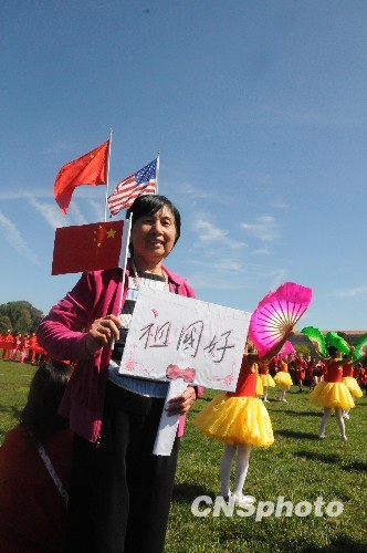 图为一名华侨举着“祖国好”的标语出席升旗仪式。