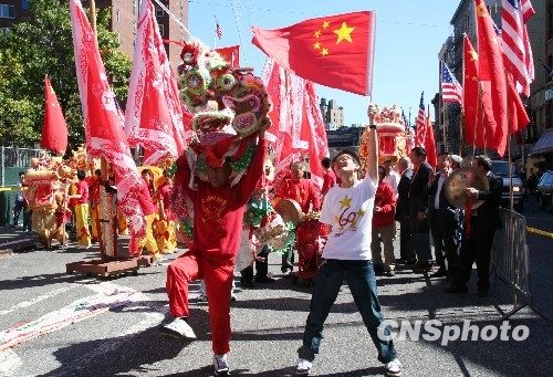 9月20日中午,象征纽约唐人街标志的“孔子雕像”前狮舞龙腾,一片人声鼎沸,美东地区的华侨华人们以六十年来最大规模的一次庆祝活动,迎接中国国庆的到来。中新社发 魏晞 摄