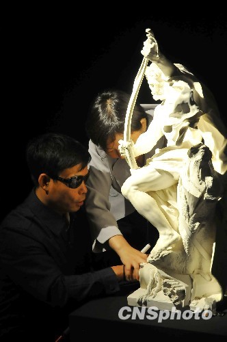 图为视障人士利用触觉方式欣赏精典作品。中新社发 潘旭临 摄