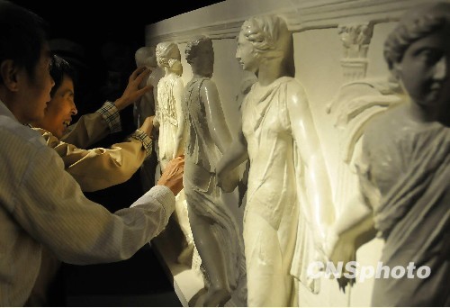 图为视障人士利用触觉方式欣赏精典作品。中新社发 潘旭临 摄