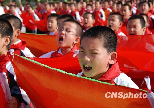 9月21日,山东滨州实验学校学生们在“迎国庆中华经典诵读比赛”中朗诵革命诗词。当天,该校学生朗诵了毛泽东、陈毅等老一辈革命家写下的“更喜岷山千里雪,三军过后尽开颜”、“南国烽烟正十年,此头须向国门悬”等经典革命诗词,并摆出“60”字样,以此祝福祖国,向祖国六十华诞献礼。中新社发 张滨 摄