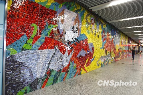 9月21日,记者“探秘”北京地铁4号线,动物园站内通道整整一面墙涂满鲜明的色彩,橙色、红色、蓝色这些强烈的色块,都是碎瓷砖拼出的动物图案,扭曲不规则的瓷片模仿了孩子们生涩的笔触,斑马、狮子、鳄鱼、熊猫。通往天文馆的通道内,则有天体壁画为乘客形象地引路。地铁4号线有望25日正式开通。中新社发 郑雄增 摄