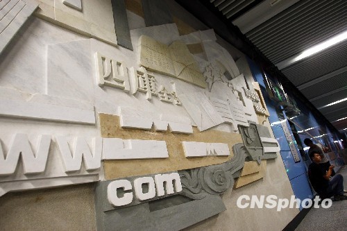 9月21日,记者“探秘”北京地铁4号线,“锁定”了8个重点车站装饰艺术壁画,其总体设计理念为“记忆历史文脉,彰显城市文化,突出地域标志”。国家图书馆站的主题为“书的海洋”,壁画以书籍的演化为主要表现元素,着重体现了国图四宝:赵城金藏、敦煌古卷、永乐大典、四库全书。地铁4号线有望25日正式开通。中新社发 郑雄增 摄