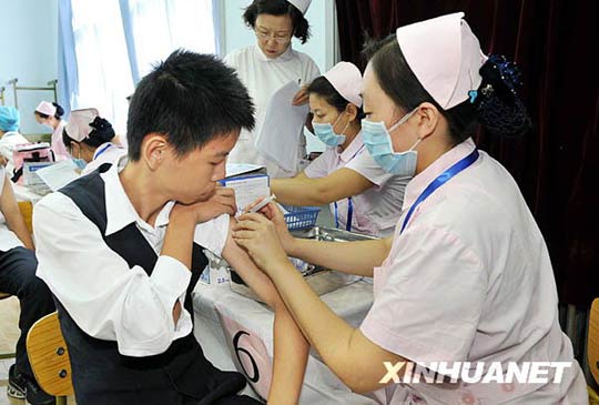 从21日起,北京市在全国率先启动甲型H1N1流感接种工作,按照不同人群疫苗接种的优先次序,北京市目前优先对参与国庆庆典活动的学生开展接种。图为京源学校的学生在接种甲型H1N1流感疫苗。