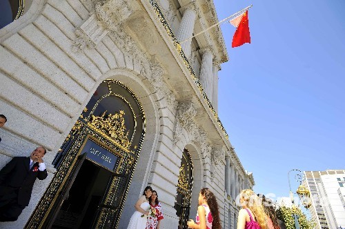 图为一对新人在飘扬着五星红旗的市府大楼前缔结连理。中新社发 陈钢 摄
