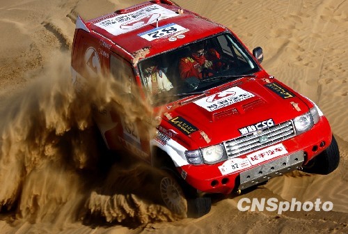 2009“巴丹吉林沙漠杯”中国越野汽车精英挑战赛暨全国汽车越野系列赛(CCR)内蒙分站赛9月21日结束,江耀桓与领航员蒋智洋配合默契、发挥出色,获得汽车组总冠军。中新社发 赵振清 摄