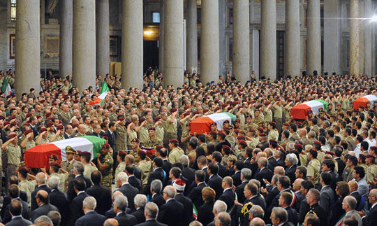 图为意大利政府为6名在阿富汗喀布尔遇袭身亡的士兵举行国葬。