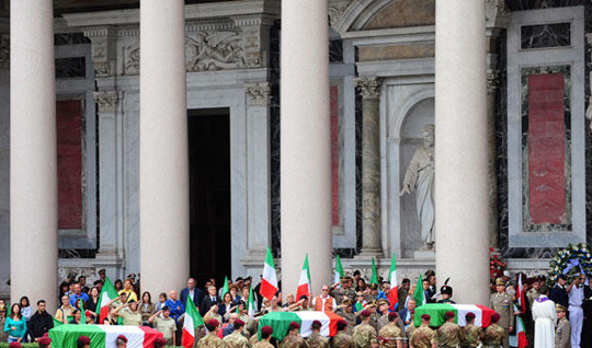 图为意大利政府为6名在阿富汗喀布尔遇袭身亡的士兵举行国葬。