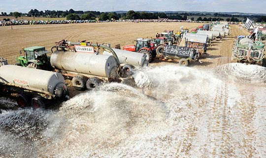 9月21日,在法国西部的圣特雷芬尼,奶农们将大约100万公升鲜奶喷洒到田地里以抗议过低奶价。从9月中旬开始,法国奶农多次倾倒牛奶抗议奶价格暴跌。