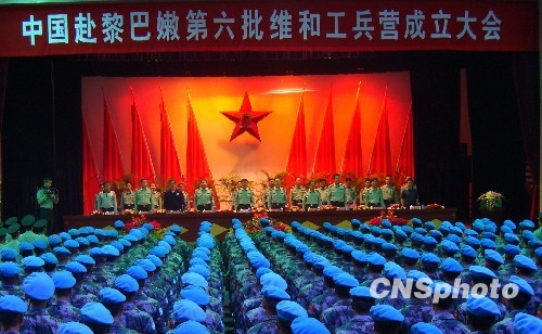 图为22日的成立大会上,275名头戴蓝色贝雷帽、身着07式迷彩服的维和工兵营官兵接受了军区领导的首次检阅。中新社发 杨洋 摄