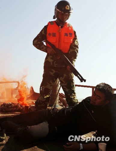 9月22日,河北海警在沧州海域举行国庆安保“忠诚四号”反恐处突演练。此次演练以国庆安保为背景,假想不法分子在境外敌对势力的蛊惑下,在沧州海域对渔民船只实施暴力抢劫。在此次海上演练中,河北海警使用的最新防暴武器——集束防爆弹发射器亮相。该装备是一种催泪性发射武器,具有发射速度快、防暴覆盖范围广的特点。中新社发 翟羽佳 摄
