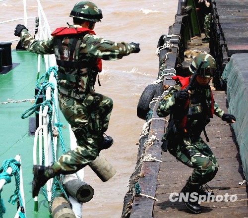 图为海警跳上“被劫”渔船实施反恐抓捕。中新社发 翟羽佳 摄