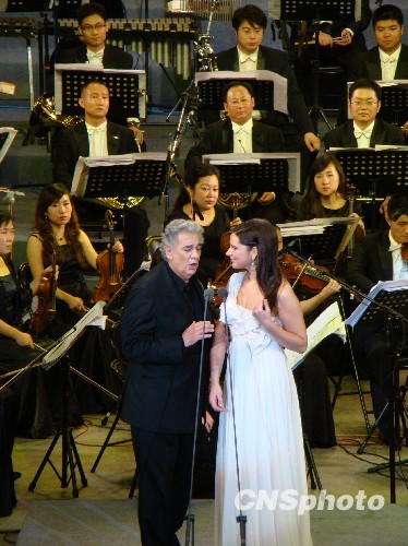 图为弗金尼亚·图拉与多明戈合唱歌曲。中新社发 王萌 摄