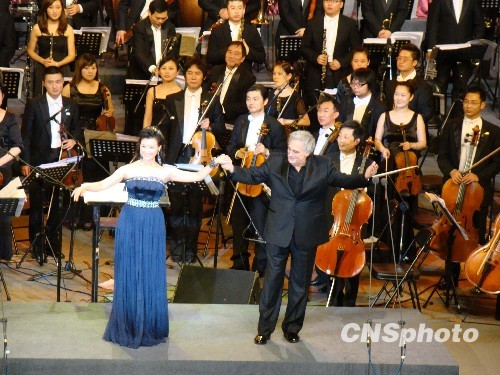 图为多明戈与宋祖英合唱歌曲。中新社发 王萌 摄