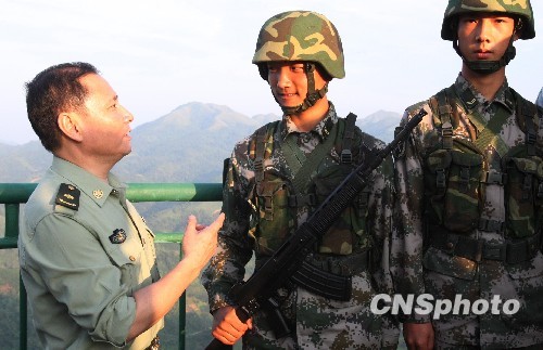 图为卢奇(邓小平扮演者)在凭祥金鸡山慰问边防官兵。中新社发 钱兴强 摄