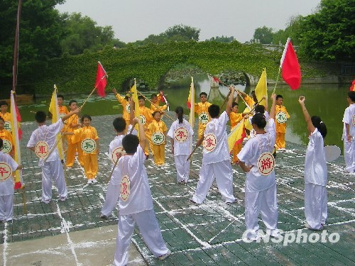 9月下旬,广东三水荷花世界举办首届人体象棋大赛,把中国武术与象棋结合起来,在一百平方米的棋盘上,由三十名练武的少年充当棋子,参赛象棋选手在棋台上手持旗子指挥。“棋子”则根据参赛选手的指挥调度,利用武术步法跳到指定的位置上。
