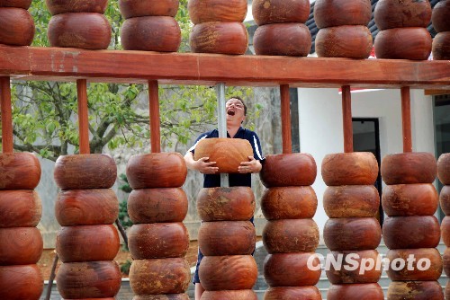 近日,一高3米,长12米,重约7吨左右的马来西亚红木制作而成的超级大算盘在江西省徽商古村亮相。这只“巨无霸”红木制算盘每颗算珠直径达42厘米,高达24厘米,每珠平均重量达70斤。中新社发 王国红 摄