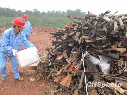 9月23日,在安徽省安庆市城西凤凰山,安庆市公安局集中销毁近期收缴的废旧炮弹、非法枪支等一批爆炸危险物品。据安庆市公安局常务副局长陈侠清介绍,今年以来,该市公安机关组织开展了清查收缴非法枪支弹药、爆炸物品、剧毒化学品等危险物品为重点的“打击防范涉枪涉爆犯罪专项行动”、“危险物品管控夏季会战”、“收缴非法枪支弹药、爆炸物品统一行动”,取得丰硕成果。全市共收缴各类废旧炮弹509枚,枪支543支、管制刀具291把。这次集中销毁非法危险品统一行动,是该市警方开展专项行动以来的一次成果展示,同时也是迎接国庆60周年安保工作的具体举措。