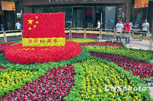 一幅用数万朵鲜花组成“国旗”亮相南昌繁华的步行街街头。中新社发 马裕淇 摄