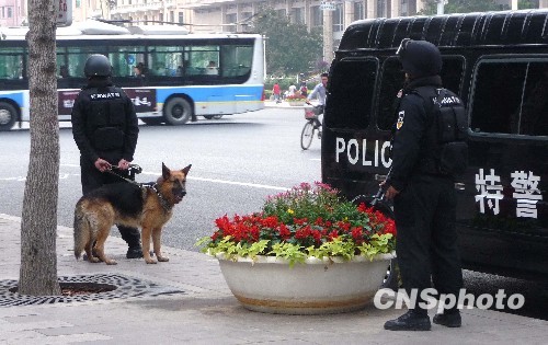 “蓝剑突击队”在北京市街头持枪携警犬在长安街上执勤,确保国庆60周年安全。中新社发 玉龙 摄