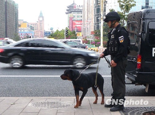 “蓝剑突击队”在北京市街头持枪携警犬在长安街上执勤,确保国庆60周年安全。中新社发 玉龙 摄