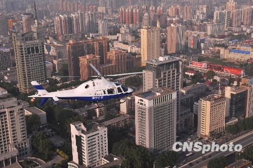 9月23日,郑州市公安局空警大队的三架警用直升机轮番编队在市区重点地域上空执行国庆安保空巡勤务。中新社发 刘书亭 摄