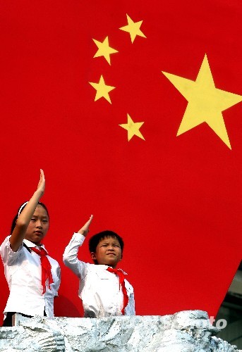 9月24日,抗震救灾小英雄林浩(右)、阳玉洁在北京“奋进四川彩车”上认真演练敬队礼。该彩车以“抗震救灾”为主题,国庆当天,将与各省彩车有序游行。中新社发 张宇 摄