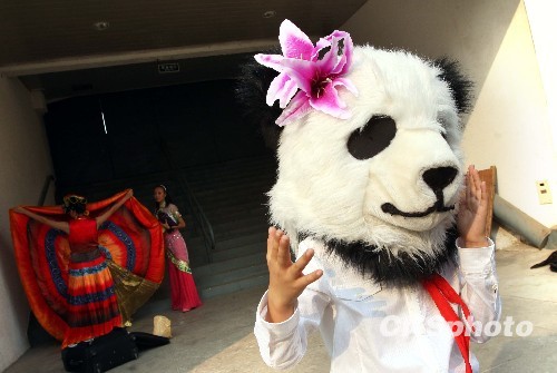 9月24日,抗震救灾小英雄林浩在北京“奋进四川彩车”旁顽皮地扮起熊猫。该彩车以“抗震救灾”为主题,国庆当天,将与各省彩车一同亮相游行。中新社发 张宇 摄
