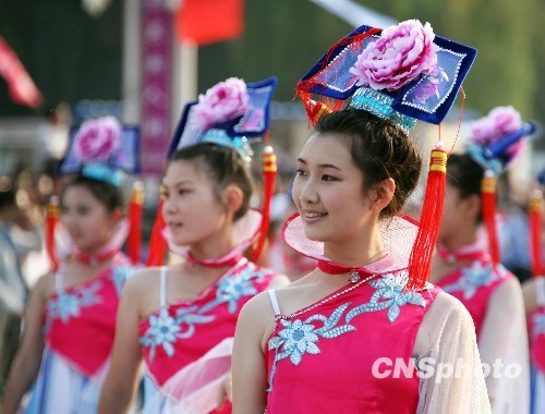 9月24日,辽宁丹东鸭绿江国际旅游节开幕,丹东各界群众和来自国内外的艺术团体一万多人,沿鸭绿江景观路举行以“庆祝建国60周年,欢腾的鸭绿江”为主题的大型花车巡游活动。中新社发 陈浩浩 摄