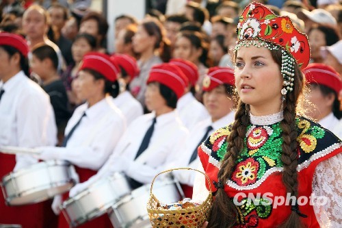9月24日,辽宁丹东鸭绿江国际旅游节开幕,丹东各界群众和来自国内外的艺术团体一万多人,沿鸭绿江景观路举行以“庆祝建国60周年,欢腾的鸭绿江”为主题的大型花车巡游活动。中新社发 陈浩浩 摄