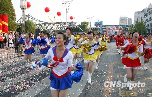 9月24日,辽宁丹东鸭绿江国际旅游节开幕,丹东各界群众和来自国内外的艺术团体一万多人,沿鸭绿江景观路举行以“庆祝建国60周年,欢腾的鸭绿江”为主题的大型花车巡游活动。中新社发 陈浩浩 摄