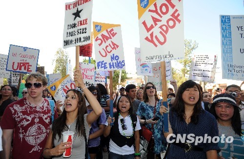图为洛杉矶分校学生怒吼“我们不是提款机”!中新社发 张炜 摄