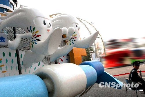 国庆节临近,参加国庆群众游行的香港彩车准备就绪,彩车上将体现东亚运动会吉祥物形象。中新社发 张宇 摄