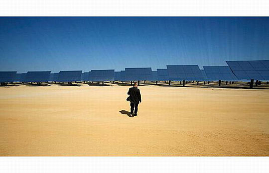高塔下面倾斜的镜板不断接受着阳光。赛维利亚这座太阳能发电厂,是整个欧洲最大的太阳能发电机构。
