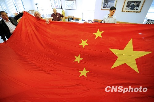 旧金山华人华侨近日特别从北京订制了三面巨幅国旗,庆祝新中国60华诞。据介绍,这三面国旗尺寸与北京天安门广场国旗班每天升降的那面国旗的大小一致。