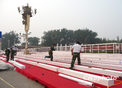 图为工作人员正在为天安门观礼台加装长“凳子”。中新社发 玉龙 摄