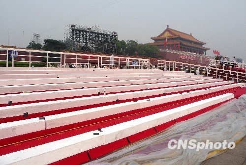 图为工作人员正在为天安门观礼台加装长“凳子”。中新社发 玉龙 摄