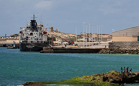一艘悬挂巴拿马国旗的商船停靠在索马里首都摩加迪沙的港口。