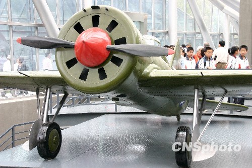 一位小朋友在南京抗日航空纪念馆触摸馆外摆放的飞机模型。中新社发 阿董 摄