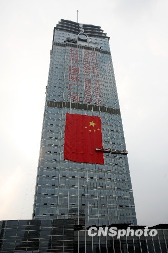 一面660多平方米的国旗在无锡市红豆国际广场主楼上挂起,整面国旗长31.5米,宽21米,占据了7个楼层。中新社发 宦玮 摄