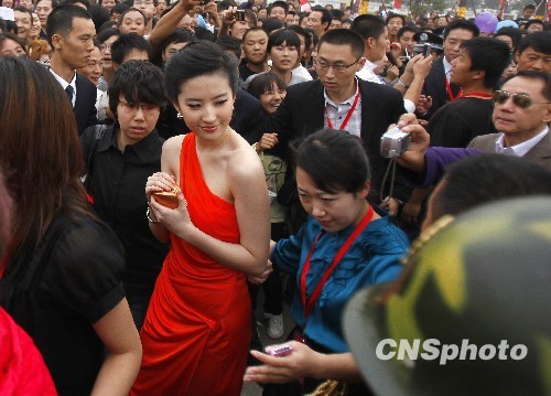 图:刘亦菲紧身红裙亮相洛阳(2)