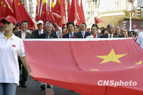 当地时间9月26日,美国旧金山数千华人华侨持巨幅国旗游行庆新中国六十华诞。 图为中国驻旧金山总领事高占生与当地侨领一起参加游行。中新社发 陈钢 摄