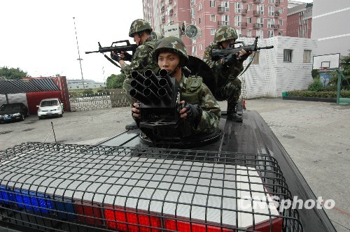 温州边防特警队员准备向“恐怖分子”发射催泪弹。中新社发 吴水斌 摄
