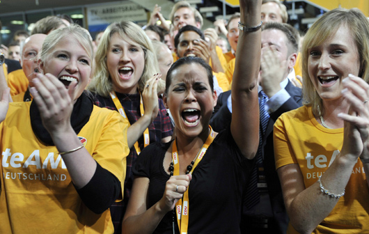 德国第17届联邦议院选举初步结果27日晚揭晓,由基民盟和基社盟组成的联盟党获得33.8%的选票,继续保持联邦议院第一大党地位。图为喜悦的联盟党支持者。