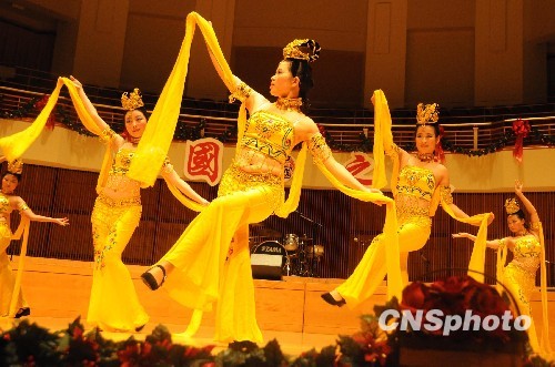 图为二十七日晚一场由大华府地区二十多所高校留学生联袂上演的“中国之夜”国庆音乐会在马里兰大学分校隆重上演,一曲充满浓郁民族风情的配乐歌舞“梦回敦煌”受到观众热烈追捧。