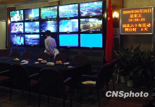 9月下旬,工作人员展示国庆游行联合指挥中心内的大型显示屏。该显示屏可以切换显示三万多个地铁站内摄像头、一万多个地面摄像头以及巡逻车上的摄像头拍摄的实时画面,以及庆典当天的电视信号。中新社发 侯宇 摄