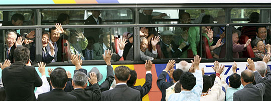 在朝鲜金刚山地区,朝方家属与坐在大巴车上即将离开的韩方亲人告别。